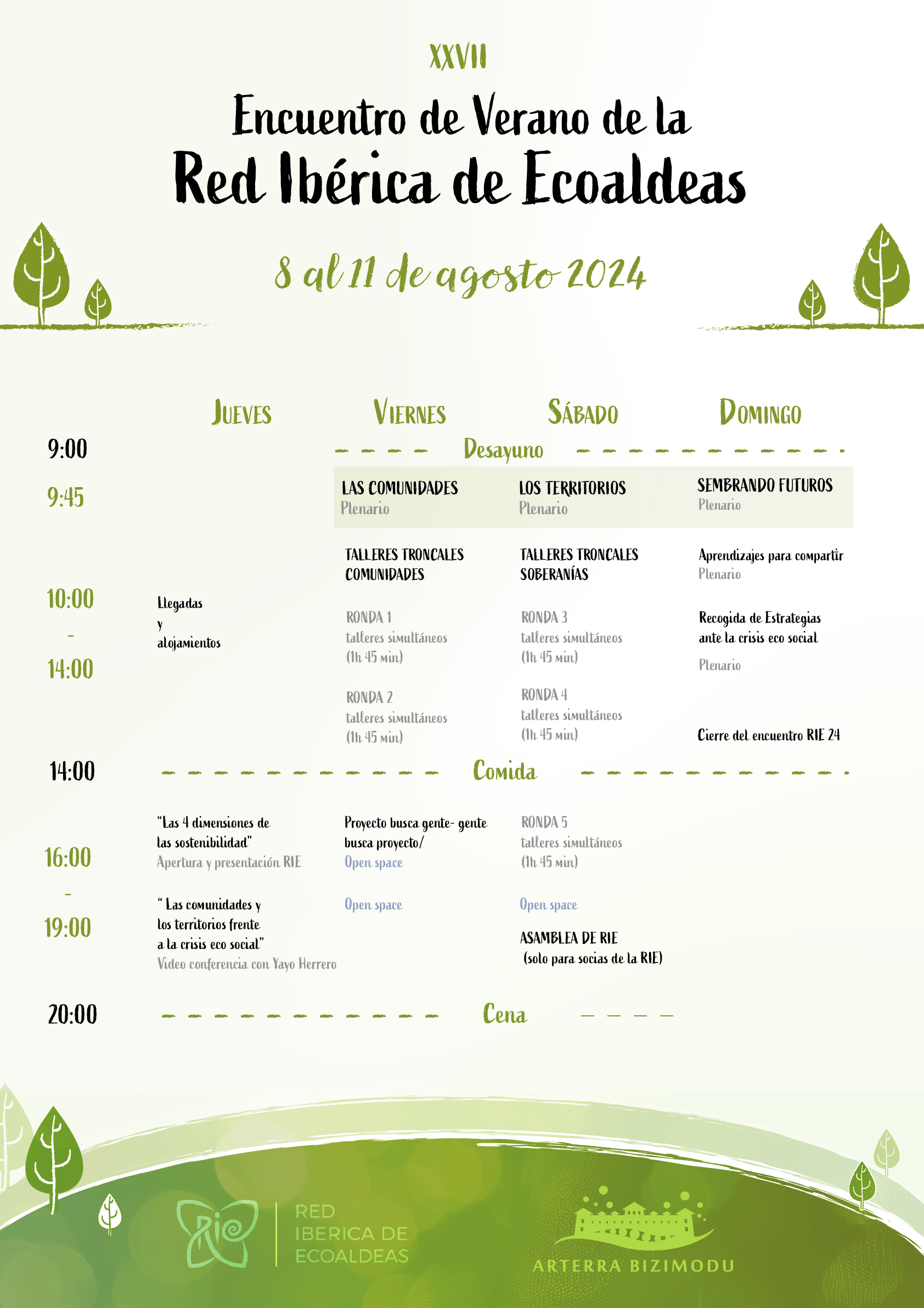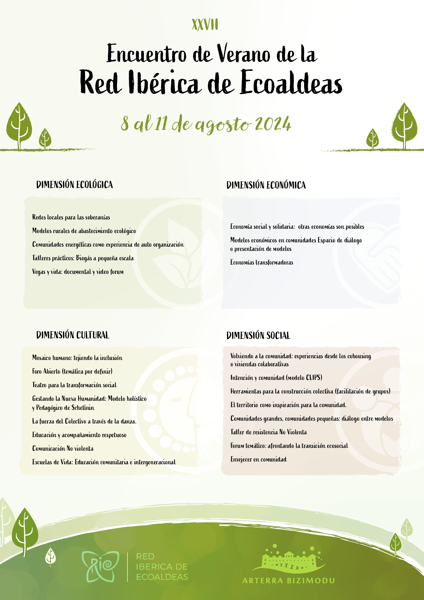 Del 8 al 11 de agosto 2024 Arterra Bizimodu acogerá el Encuentro de Verano de la Red Ibérica de Ecoaldeas (RIE). En esta XXVII edición volveremos a convocar a personas y proyectos, esperando que al juntarnos renovemos energías, fortalezcamos nuestras redes y nos inspiremos de cara a buscar soluciones ante la crisis ecosocial actual.