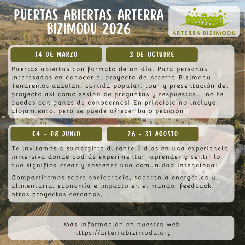 | 3 de Octubre | Puertas abiertas con formato de un día. Para personas interesadas en conocer el proyecto de Arterra Bizimodu. Tendremos auzolan, comida popular, tour y presentación del proyecto así como sesión de preguntas y respuestas… ¡no te quedes con ganas de conocernos! En principio no incluye alojamiento, pero se puede ofrecer bajo petición. |